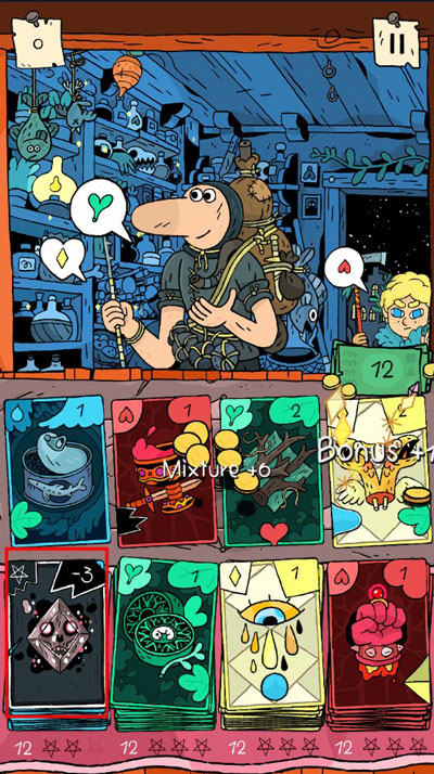 游戏里的每位顾客都有不同的药水需求,玩家需要合理选择卡牌进行合成。