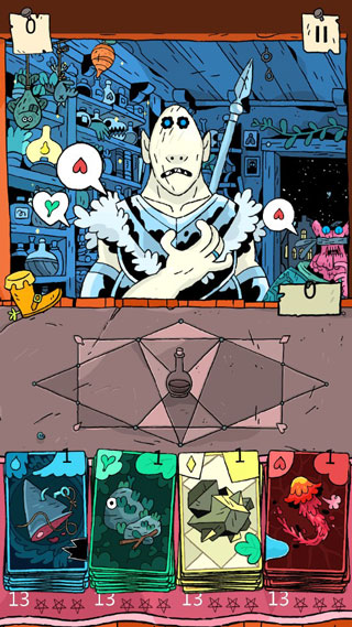 玩家需要选择并组合四种颜色的元素卡牌,根据顾客的需求调制出对应的药水。